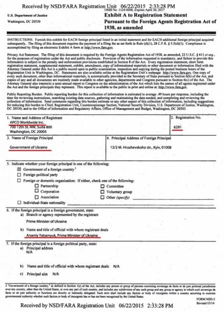 «Владелец регистрации (компания APCO Worldwide Inc.) и иностранное государство (правительство Украины) все еще обсуждают условия участия владельца регистрации. Тем не менее, за это время ожидается, что владелец регистрации предоставит услуги по связям со СМИ в США для иностранного государства до 31 июля 2015 года за фиксированную плату в 35 тысяч долларов», – цитирует текст заявки издание Корреспондент.