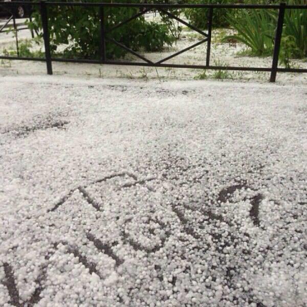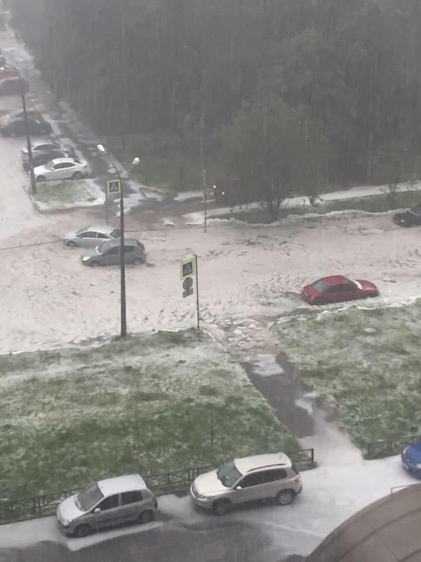 Многие улицы северной столицы затоплены, некоторые устланы градом. Пользователи соцсетей выкладывают фотографии дорог и дворов города.