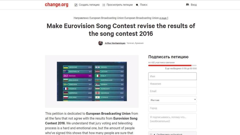 Зрители Евровидения выразили своё недовольство итогами крупнейших в мире состязаний артистов посредством петиции, размещённой на сайте Change.org. Её авторы вежливо, но уверенно просят организаторов — Европейский вещательный союз — пересмотреть результаты конкурса.