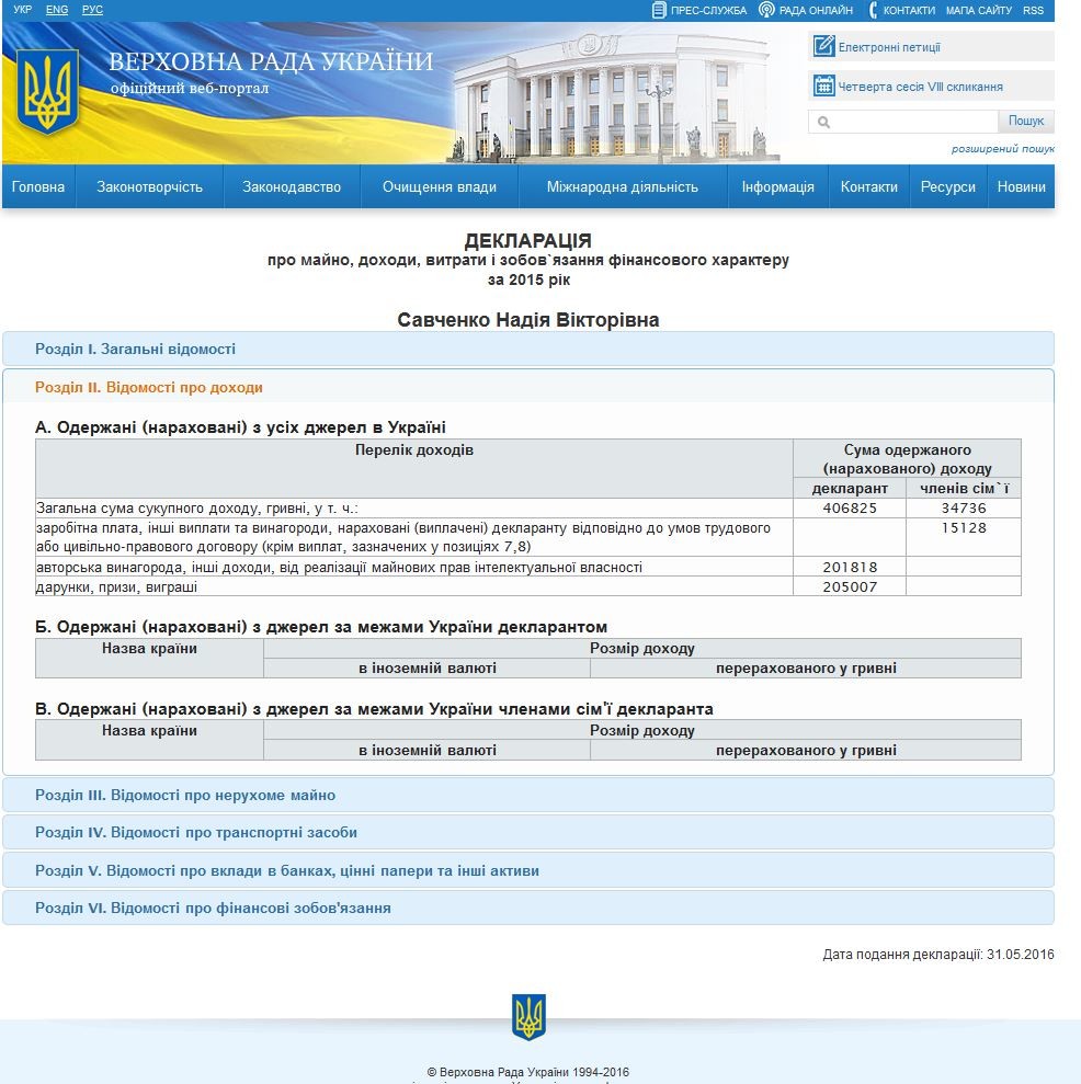 В документе также публикуются доходы семьи Савченко, которые составили 34,136 тыс. гривен (около 91 тыс. рублей).