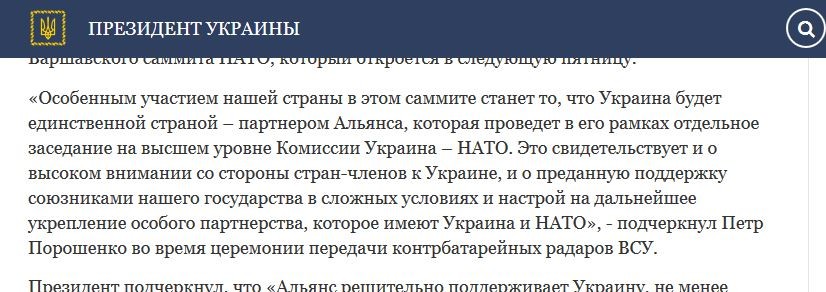 «Особенным участием нашей страны в этом саммите станет то, что Украина будет единственной страной — партнёром альянса, которая проведёт в его рамках отдельное заседание на высшем уровне комиссии Украина — НАТО. Это свидетельствует и о высоком внимании со стороны стран-членов к Украине, и о преданную поддержку союзниками нашего государства в сложных условиях и настрой на дальнейшее укрепление особого партнёрства, которое имеют Украина и НАТО», — приводятся слова Порошенко на официальном сайте украинского лидера.
