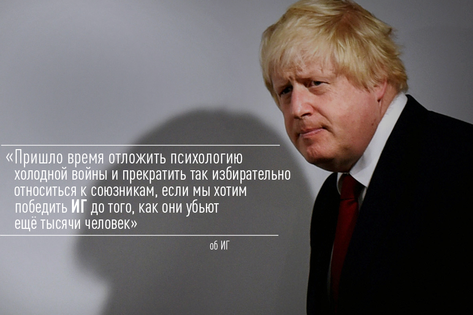 Борис Джонсон давал оценки не только политикам, но и самым острым событиям в мире, например таким, как сирийский конфликт и борьба с ИГ*. «Поддерживаю ли я режим Асада и Россию в их совместном деле по возвращению этого потрясающего памятника истории? Несомненно. Это не означает, что я доверяю Путину и хочу, чтобы Асад бесконечно оставался у власти. Но мы не можем сидеть на двух стульях одновременно», — заявил он, комментируя возвращение сирийского города Пальмира, а также одновременную борьбу США против Асада и ИГ.