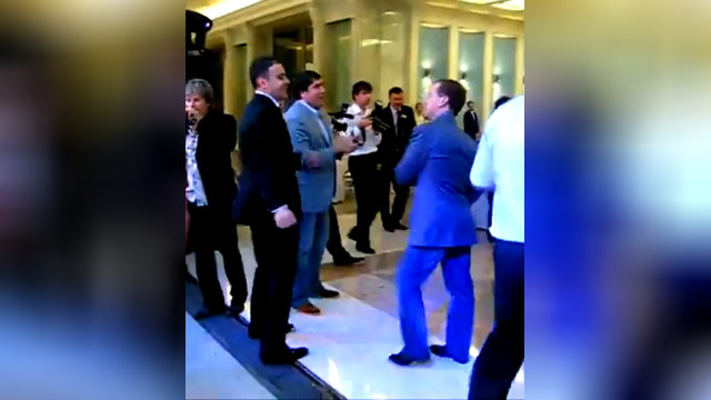 Сшитый по фигуре серебристый костюм, расстегнутая рубашка, а в них - Дмитрий Медведев, покачивающий неловко бедрами и чуть приседающий в ритм диско-хита. Вокруг - элегантно одетые господа и дамы. Другие двигаются под музыку куда умелее президента.