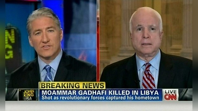 Джон Маккейн считает, что гибель Муаммара Каддафи заставит задуматься многих политиков по всему миру. В частности, американский сенатор предположил, что из-за последних событий Владимир Путин чувствует себя немного некомфортно.