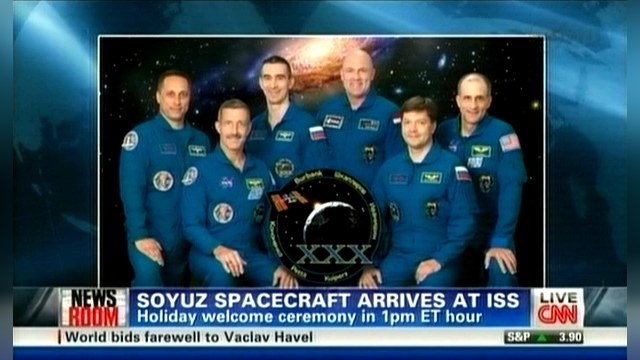 Мы нашли ее. Начинаем. Приборы в строю. Российский космический корабль «Союз» состыковался с МКС, Международной комической станцией. Сейчас должно произойти открытие люка. Церемония приветствия вновь прибывших намечена на 1:00 по восточноевропейскому времени. Мы постараемся показать вам это также в прямом эфире.