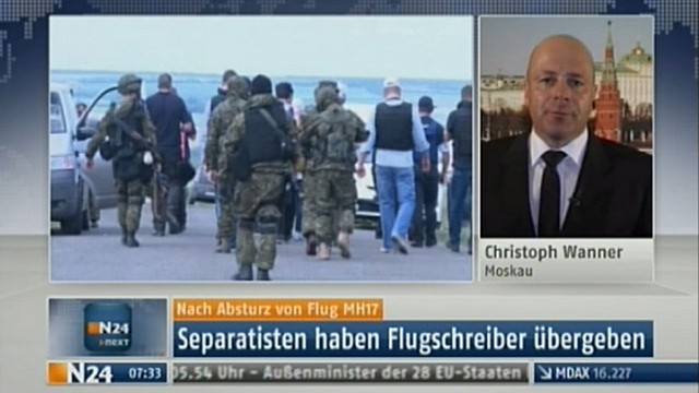 КРИСТОФ ВАННЕР, корреспондент N24: Путин остается при своем мнении. Он говорит, что Украина несет ответственность за катастрофу. Теперь российские военные идут в наступление: они представили снимки со спутника и схемы траекторий полета. На них предположительно можно видеть установку ПВО Украины непосредственно в районе конфликта, то есть на месте ведения боевых действий против сепаратистов.