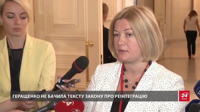 ИРИНА ГЕРАЩЕНКО, уполномоченная президента по мирному урегулированию ситуации в Донбассе: Сегодня законопроект не подан, не зарегистрирован в Верховную раду. По моей информации, на следующей неделе может состояться заседание Совета безопасности и обороны, где будет рассмотрен полный текст закона.