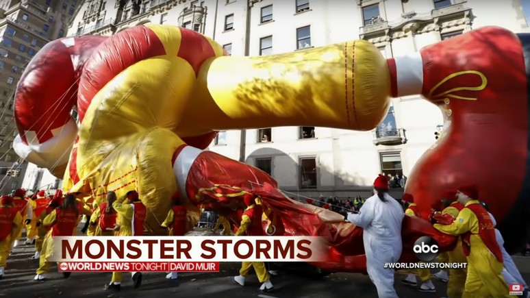 ВЕДУЩИЙ: Мы также сегодня отслеживаем две мощных бури. Одна из них ударила по восточной части страны, создав опасность для воздушных шаров на параде в Нью-Йорке. Вот, взгляните — сильный ветер прорвал дыру в «Рональде Макдональде» и вывел шар из строя, а «Щелкунчик» сбил с ног одного из собственных «водителей».