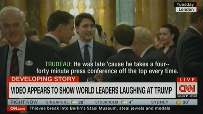 Видеозапись, которую вы только что просмотрели, за ночь разошлась по сети. По сути, это мировые лидеры, которых камера засняла, судя по всему, смеющимися над президентом Трампом на приёме в Букингемском дворце. На этом видео канадский премьер Джастин Трюдо говорит, что он… опоздал, потому что вдобавок ко всему устраивает 40-минутную пресс-конференцию. Он говорил это небольшой группе мировых лидеров, в том числе президенту Франции Эммануэлю Макрону и британскому премьеру Борису Джонсону. Трюдо также говорит, что только что видел, как у его команды челюсти отвисли до пола. Никто не называет президента Трампа по имени, и, похоже, они не отдают себе отчёт в том, что камеры всё снимают.