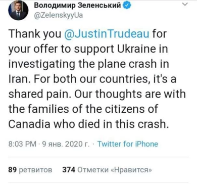 «Благодарю Джастина Трюдо за предложение поддержать Украину в расследовании крушения самолёта в Иране. Для обеих наших стран это общая боль. Наши мысли с семьями граждан Канадии, погибших в этой катастрофе», — написал Зеленский.