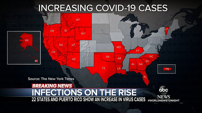 И Аризона, и Техас зафиксировали новые «рекорды» госпитализаций среди восьми штатов, где наблюдается подъём. Тем временем в 22 штатах и Пуэрто-Рико сообщается о росте заболеваемости.