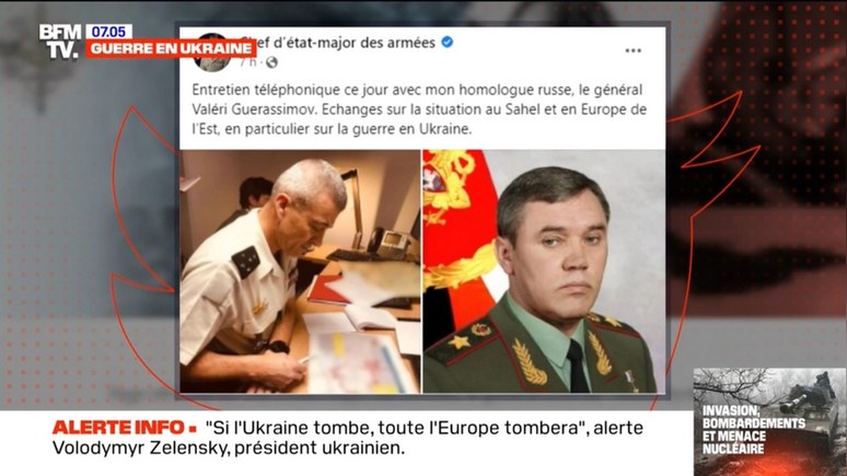 ВЕДУЩИЙ BFM TV:ВоФранции о таком заявляют редко: начальник Главного штаба ВС генерал Бюркар сообщил вечером, что провёл переговоры со своим российским коллегой Валерием Герасимовым.