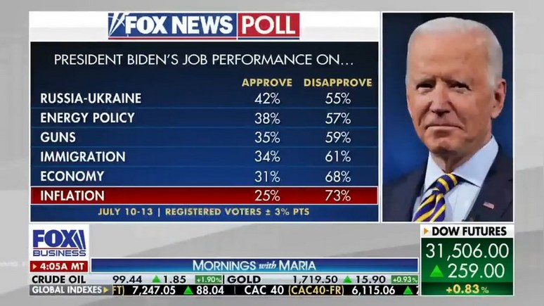 Но проблема в том, что Путин больше не фигурирует в новостях, боевые действия на Украине не фигурируют в новостях, а фигурирует инфляция, и непохоже, чтобы кто-то что-то делал по этому поводу. Думаю, это главная причина: инфляция вышла из-под контроля, а плана, понятного простым американцам, похоже, нет.