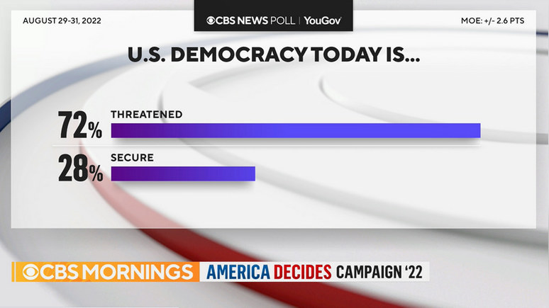 Согласно последнему опросу CBS News, более 70 процентов американцев считают, что американская демократия в опасности, а более половины из них полагают, что в США участятся случаи политического насилия. К нам присоединяется наш директор по выборам и опросам Энтони Салванто. Он составляет опросы, а затем подробно рассказывает нам о мнении граждан США. Рад вас снова видеть. На прошлой неделе президент Байден произнёс большую речь, в которой заявил, что демократия находится в опасности. Данные наших опросов говорят о том, что в его словах есть истина, не так ли?