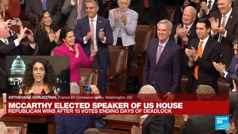 КЕТЕВАН ГОРДЖЕСТАНИ, корреспондент France 24 в Вашингтоне: Сегодняшний вечер здесь, в Вашингтоне, для Кевина Маккарти начался на самом деле с самого серьёзного удара и самого большого поражения за все эти 15 раундов голосования: шёл 14-й раунд, и он вышел к журналистам с очень уверенным настроем — говорил, что набрал достаточное количество голосов для избрания, он был абсолютно в этом убеждён. Однако в итоге в самый последний момент член палаты представителей Мэтт Гетц воздержался от голосования — и тем самым на 14-м раунде лишил Кевина Маккарти позиции спикера.