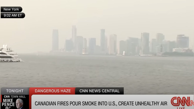 Вы смотрите на изображение Нью-Йорка в прямом эфире. Да, дыма много. Этим утром более 30 миллионов человек находятся в состоянии повышенной готовности из-за качества воздуха. Дым от лесных пожаров в Канаде движется на юг, окутывает американские города по всему северо-востоку, Средней Атлантике и Среднему Западу.