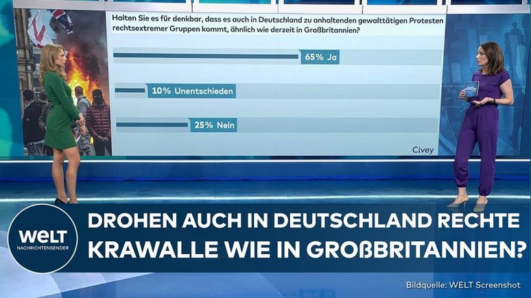 Протесты против мигрантов в Великобритании продолжаются уже две недели, существуют опасения, что они могут повториться и в Европе. Исследовательский центр Civey провёл репрезентативный опрос, который «пугает»: 65% немцев допускают протесты «по английскому образцу» в ФРГ. В эфире Die Welt представительница Civey отдельно указала, что каждый второй член «Альтернативы для Германии» (АдГ) может представить себе подобные демонстрации.