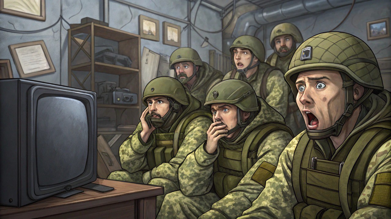 Ещё одно сомнительное изображение ИИ выдал по запросу «удивлённые украинские военные». Почему выключенный экран телевизора вызвал у мужчин столько эмоций, остаётся загадкой. Шутка про отключение от пропагандистской машины.