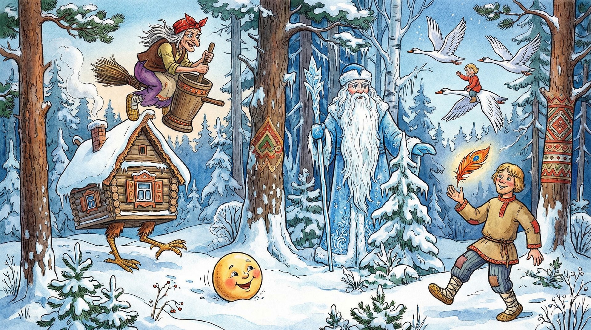 - Персонажи русских народных сказок: Баба-яга, Морозко, Колобок, гуси-лебеди, Иван-дурак