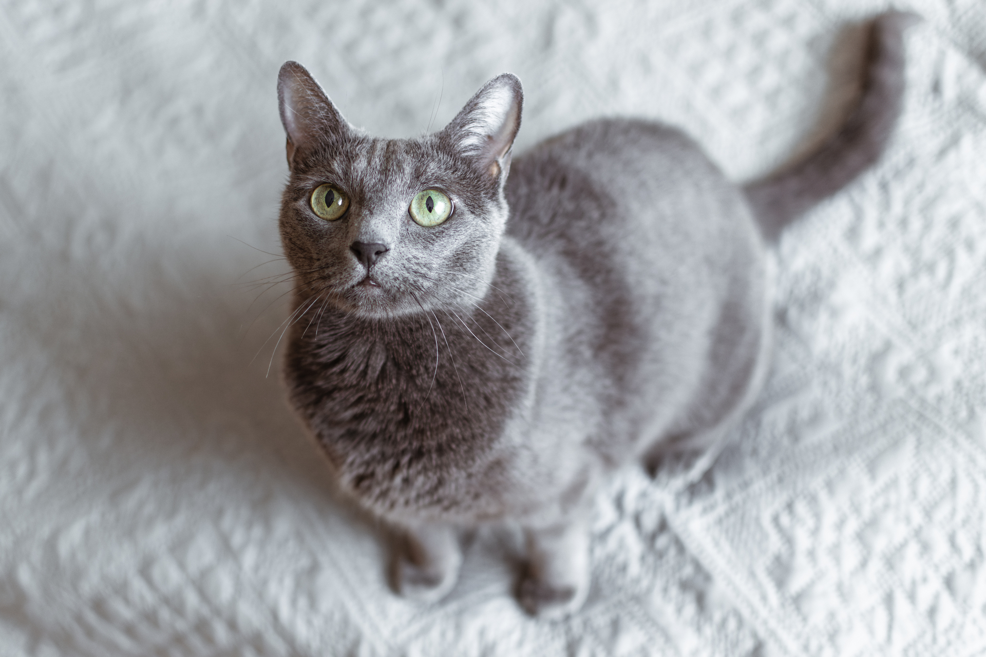Русская голубая кошка тоже короткошёрстная. Окрас у неё однотонный, серо-голубой, а глаза — зелёные. Порода известна с XIX века. И хотя выведена она в Англии, родоначальником её были кошки из Архангельска. В 1893 году английская заводчица Карен Кокс вывезла пару голубых котят, с которых и начала разведение породы. Русские голубые кошки сразу полюбились европейцам за отличные качества крысоловов, за необычный окрас и нежную, словно плюшевую шерсть.