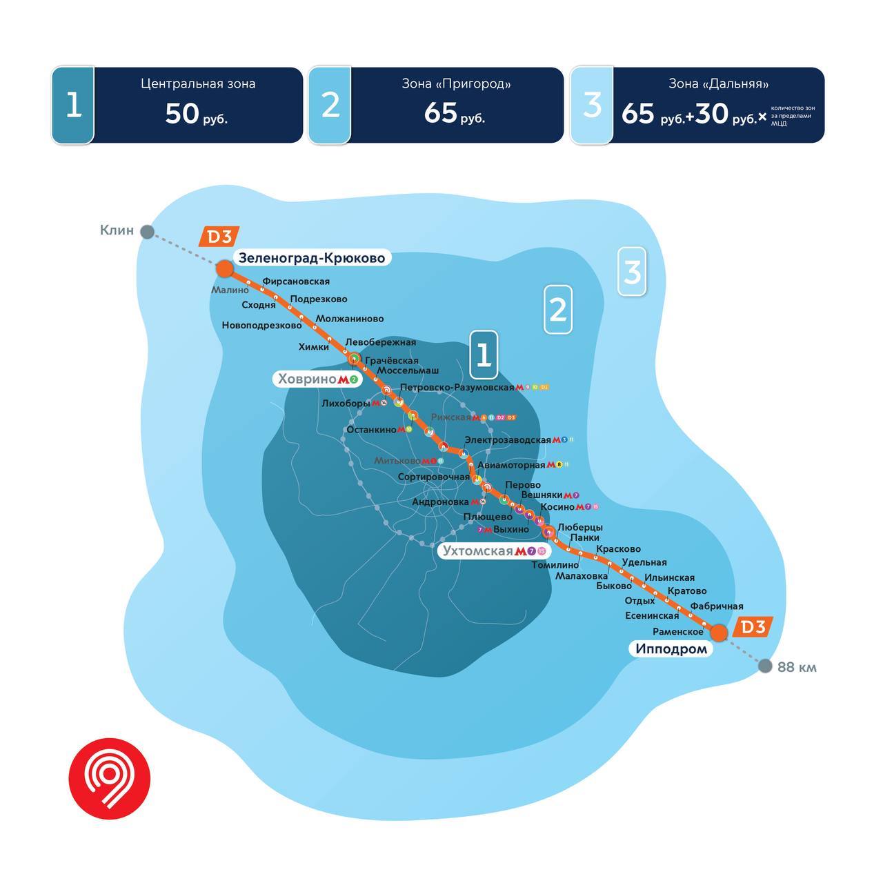 МЦД-3 представляет собой маршрут протяжённостью 85 км, на котором расположено 41 станций, из которых 14 — с пересадками: на метро, Московское центральное кольцо и пригородные направления железной дороги. Эта линия свяжет между собой московский Зеленоград и подмосковное Раменское.