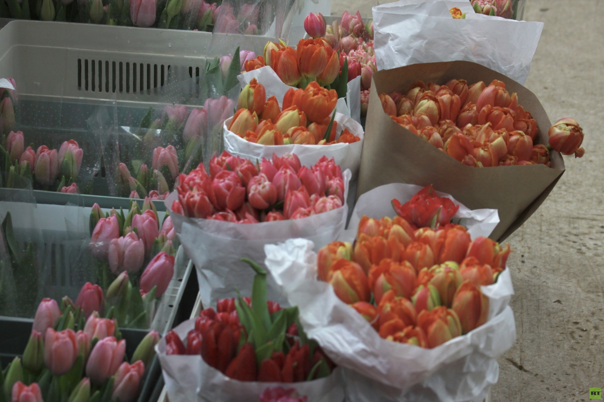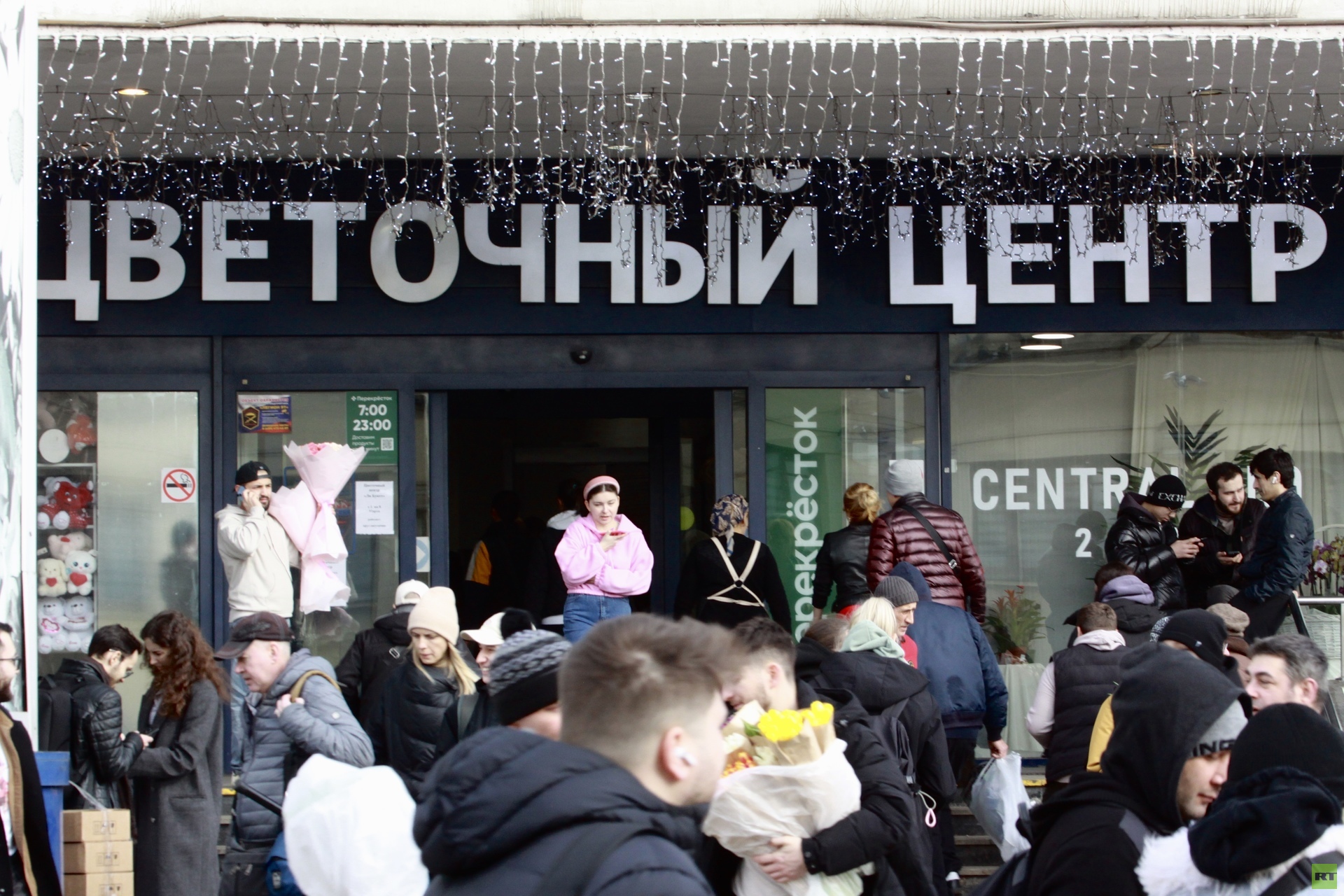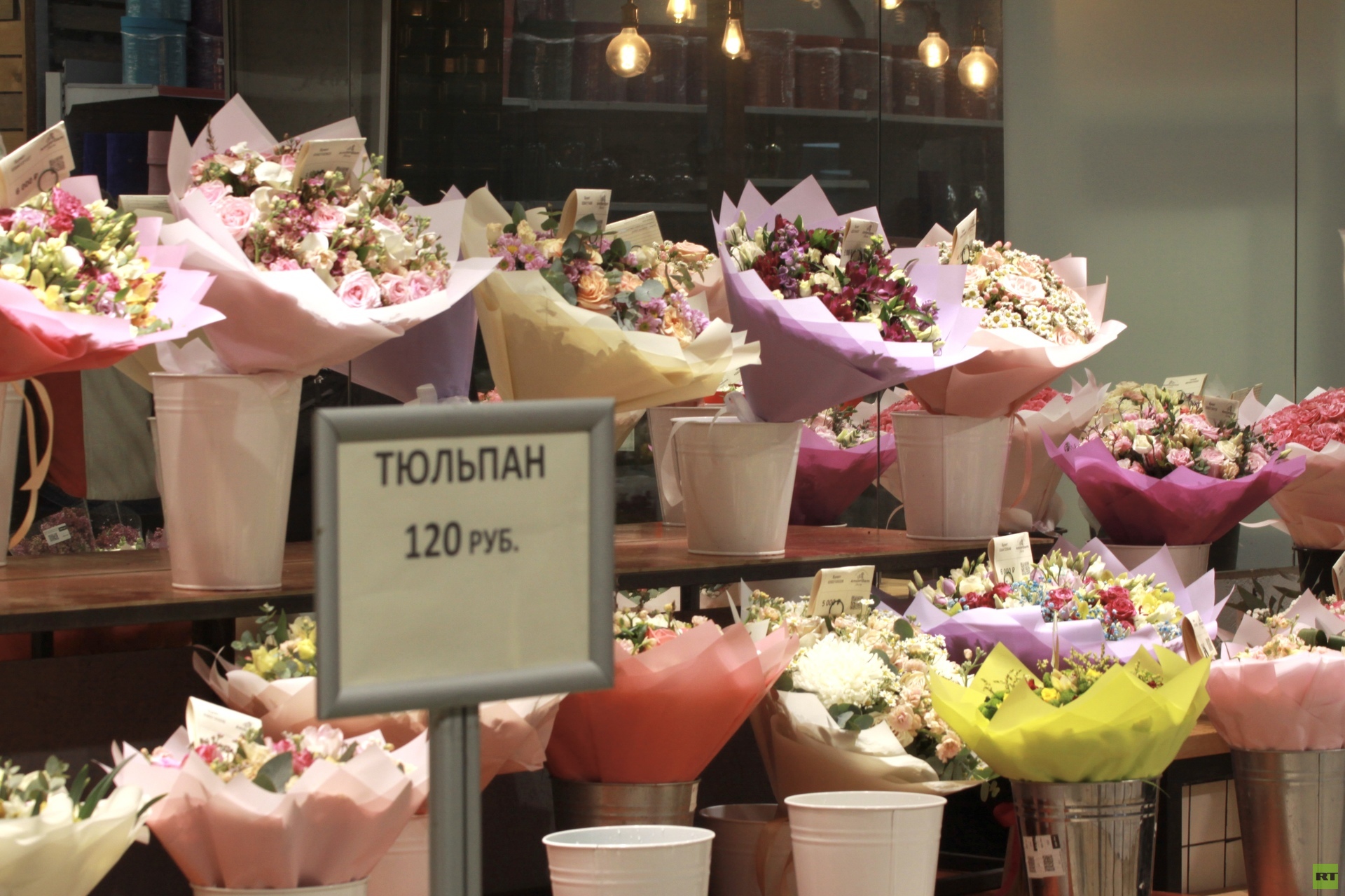 Внутри здания царит оживлённая суета. Покупатели пробираются между прилавками, разглядывая тюльпаны всех оттенков, алые розы и пышные пионы.