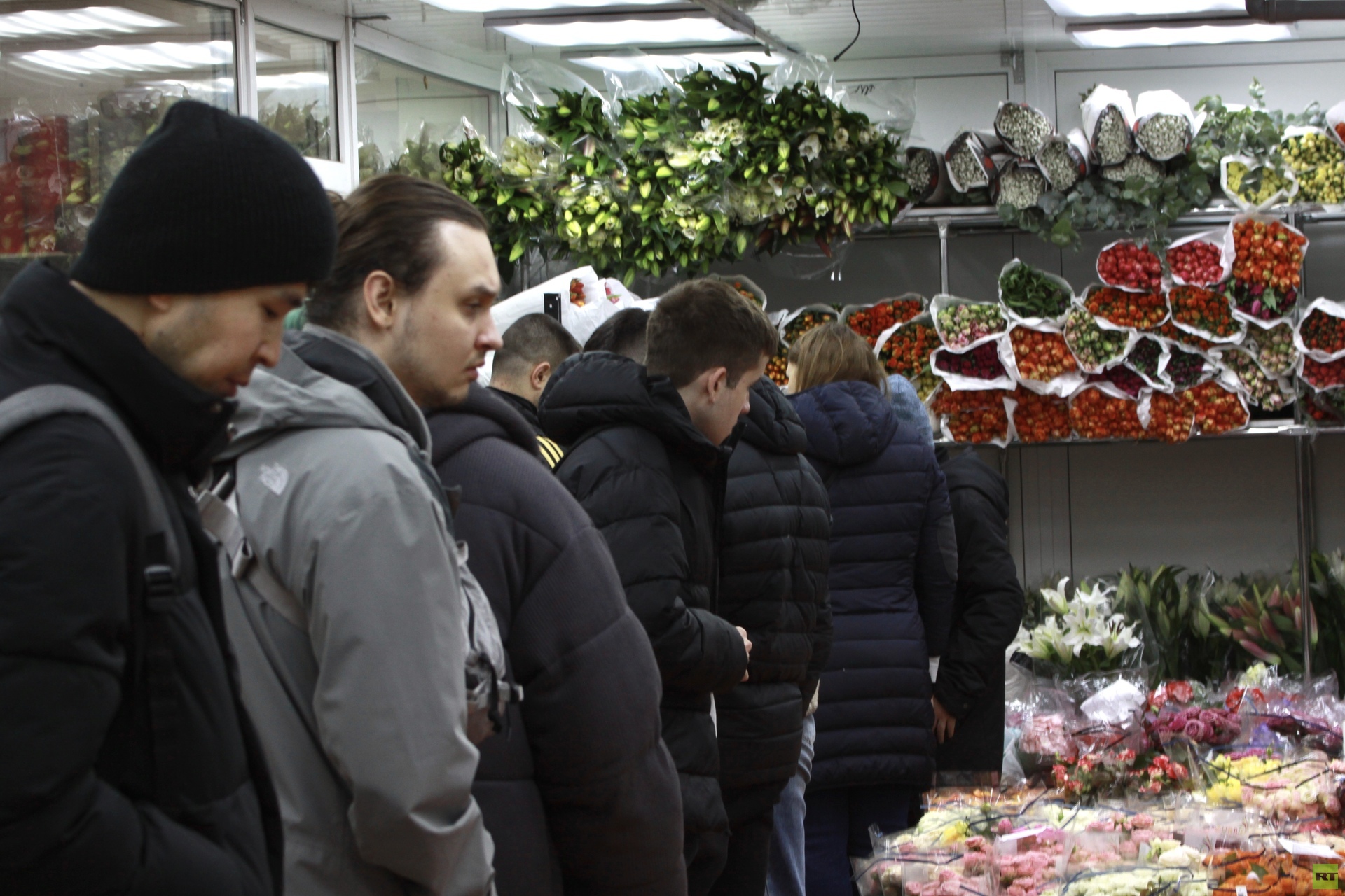 Уже на подступах к рынку чувствуется праздничное настроение. На станции метро «Рижская» десятки мужчин с букетами в руках направляются к выходу. На территории рынка людей ещё больше: очередь на вход растягивается на десятки метров.