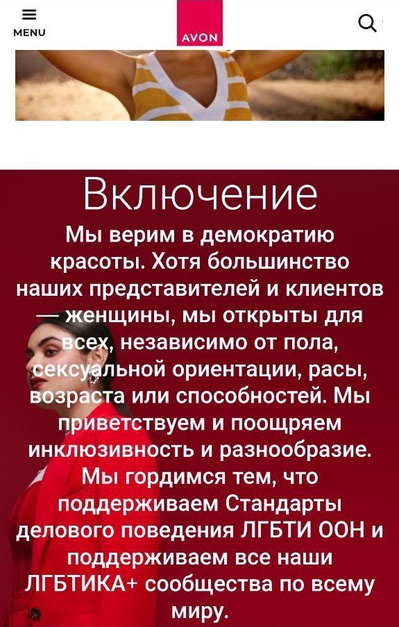 «Avon Россия» подчёркивает, что в своей деятельности всегда соблюдает законодательство Российской Федерации и никогда не осуществляла и не осуществляет каких-либо действий, направленных против интересов России и граждан. Компания не оказывает поддержку Вооружённым силам Украины, ЛГБТ, а также другим организациям, деятельность которых противоречит законодательству Российской Федерации».