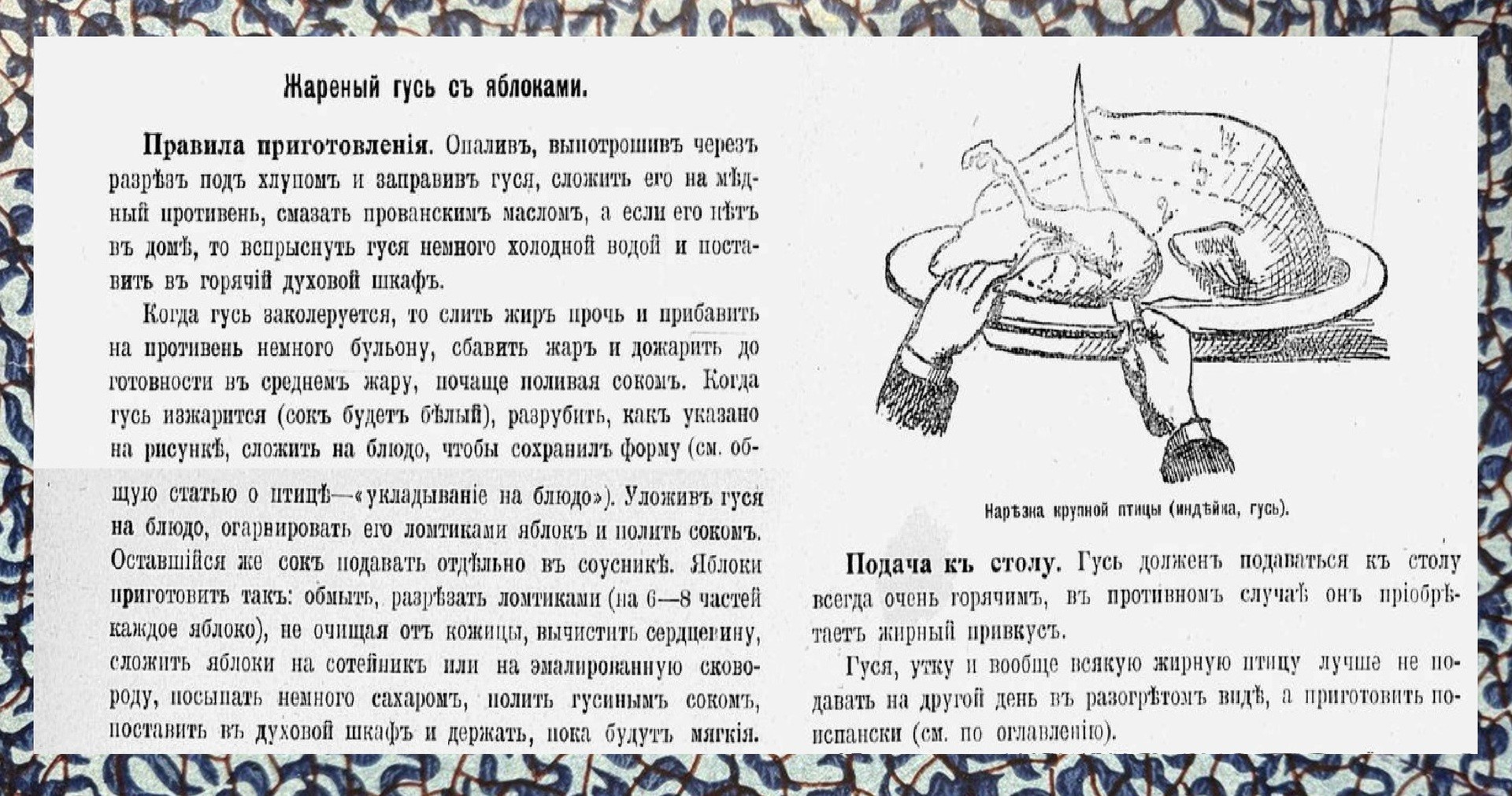 В кулинарных книгах XIX века можно найти много традиционных рождественских блюд. Историк кулинарии Александр Белохвостиков поделился с RT рецептом жареного гуся с яблоками из поваренной книги Пелагеи Александровой-Игнатьевой «Практические основы кулинарного искусства», первое издание которой вышло в 1899 году: