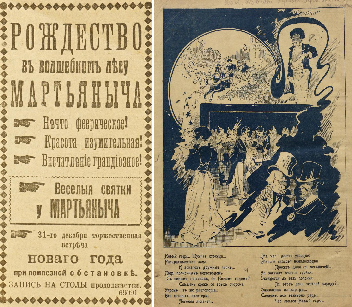 Традиция встречи Нового года существовала в дореволюционной России, может быть, меньше по масштабу и с другим смысловым наполнением, чем празднование Рождества. Страницы предпраздничных газет пестрели объявлениями, обещавшими в новогоднюю ночь в ресторанах угощение, музыку и веселье.