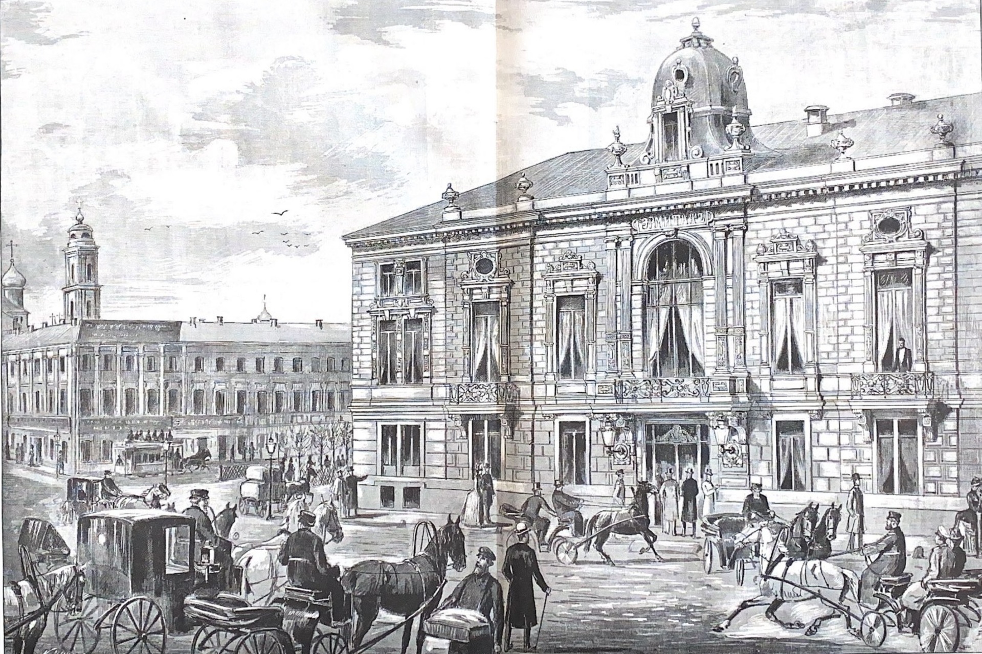 • Главный вход в гостиницу «Эрмитаж» Оливье. Рисунок К. Чичагова. «Всемирная иллюстрация». 1886 год