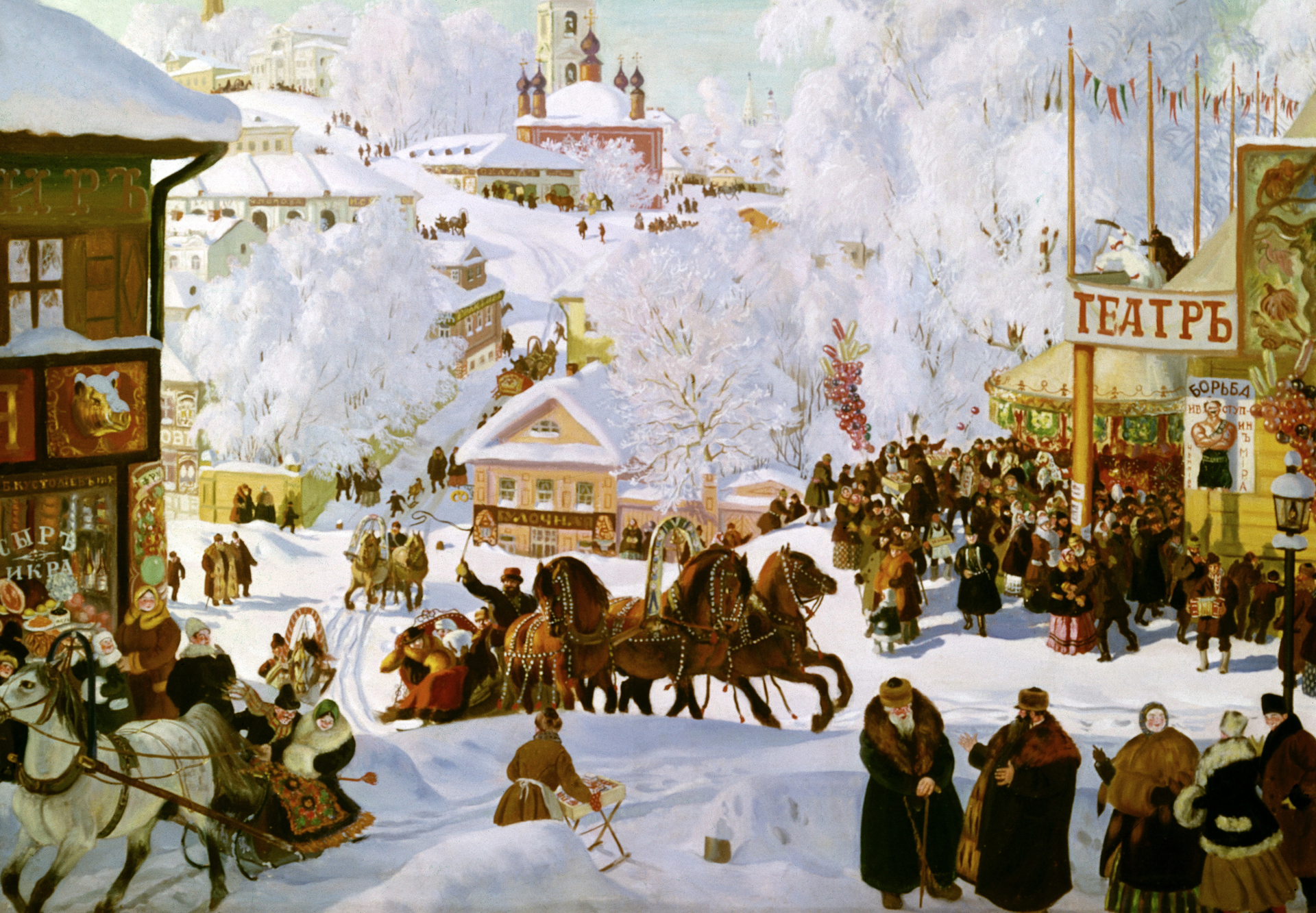 • Репродукция картины «Масленица (Масленичное катание)». Холст, масло, 1919 год. Художник Борис Кустодиев