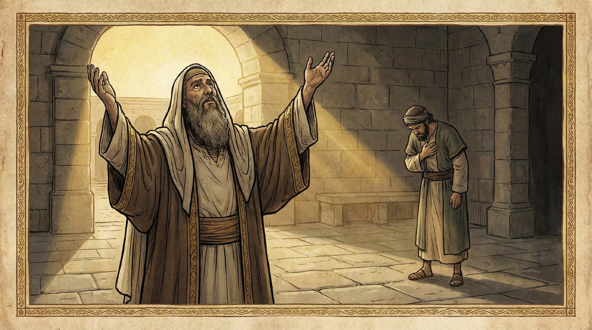 В притче Иисус рассказывает, как фарисей и мытарь молятся в храме. Фарисей благодарит Бога за то, что он «не такой, как прочие люди», а мытарь лишь смиренно просит: «Боже, будь милостив ко мне, грешному». И Христос говорит, что именно мытарь ушёл оправданным. Главная мысль этой притчи — Богу важны не внешняя правильность и показная святость, а смирение и искреннее покаяние.