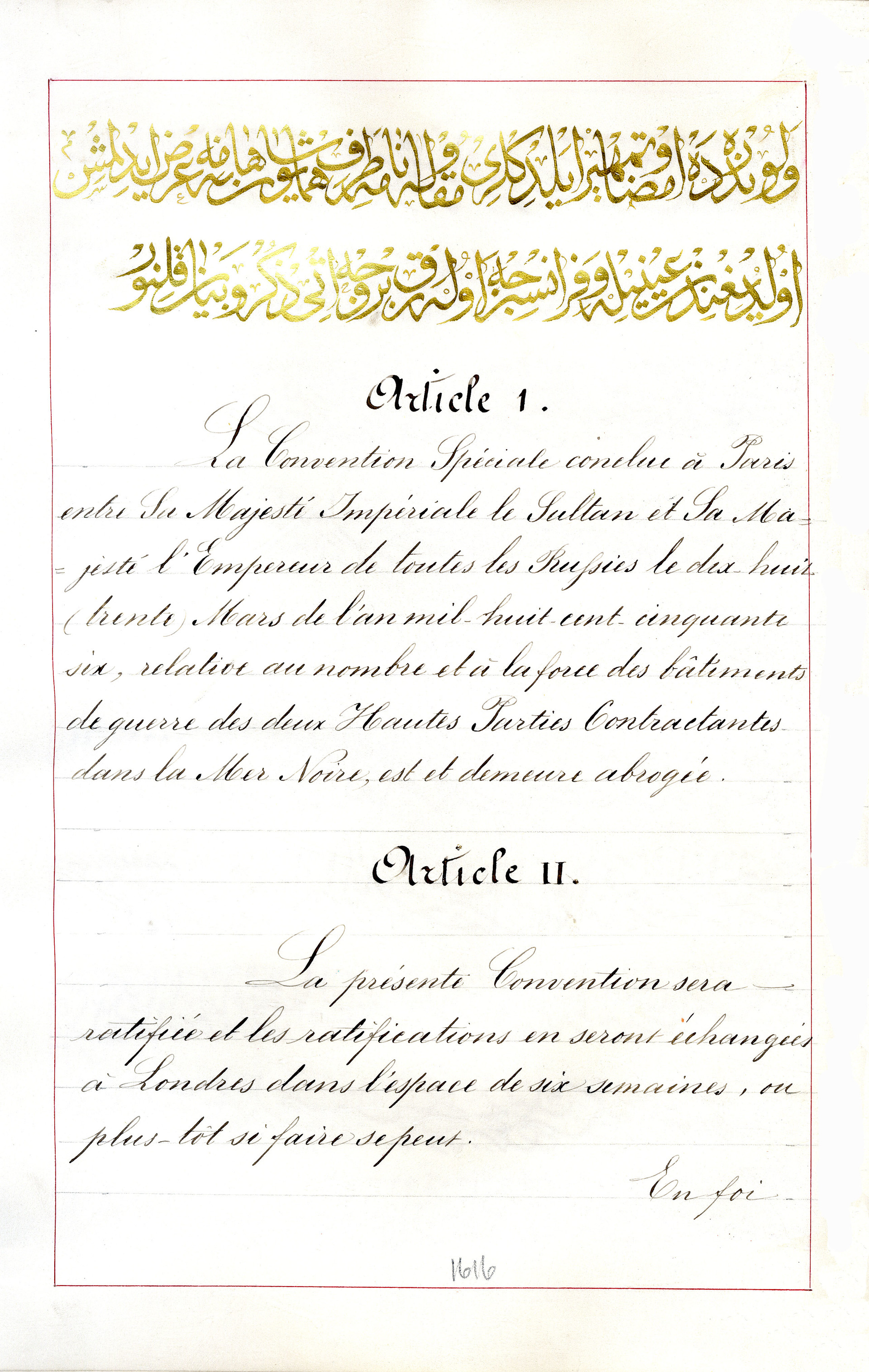 - Одна из страниц турецкой ратификационной грамоты Соглашения между Россией и Турцией от 1/13 марта 1871 года об отмене Конвенции о военных судах в Черном море от 18/30 марта 1856 года