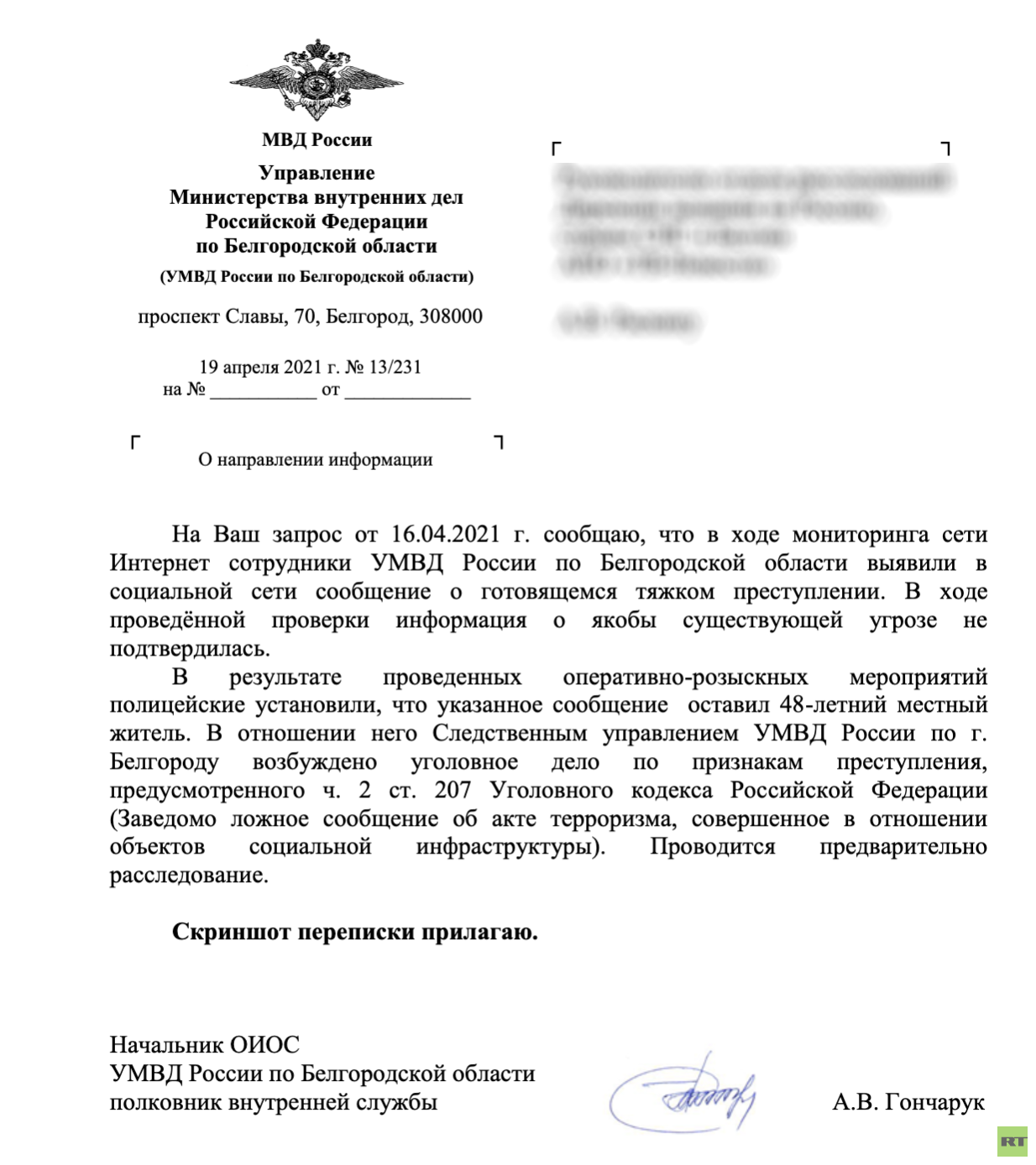 В УМВД России по Белгородской области RT также подтвердили, что пост был опубликован и обнаружен ещё в январе. По словам начальника отдела информации и общественных связей областного УМВД Алексея Гончарюка, публикация была выявлена в ходе мониторинга интернета. По данному факту санкционировали проверку, а затем возбудили уголовное дело.