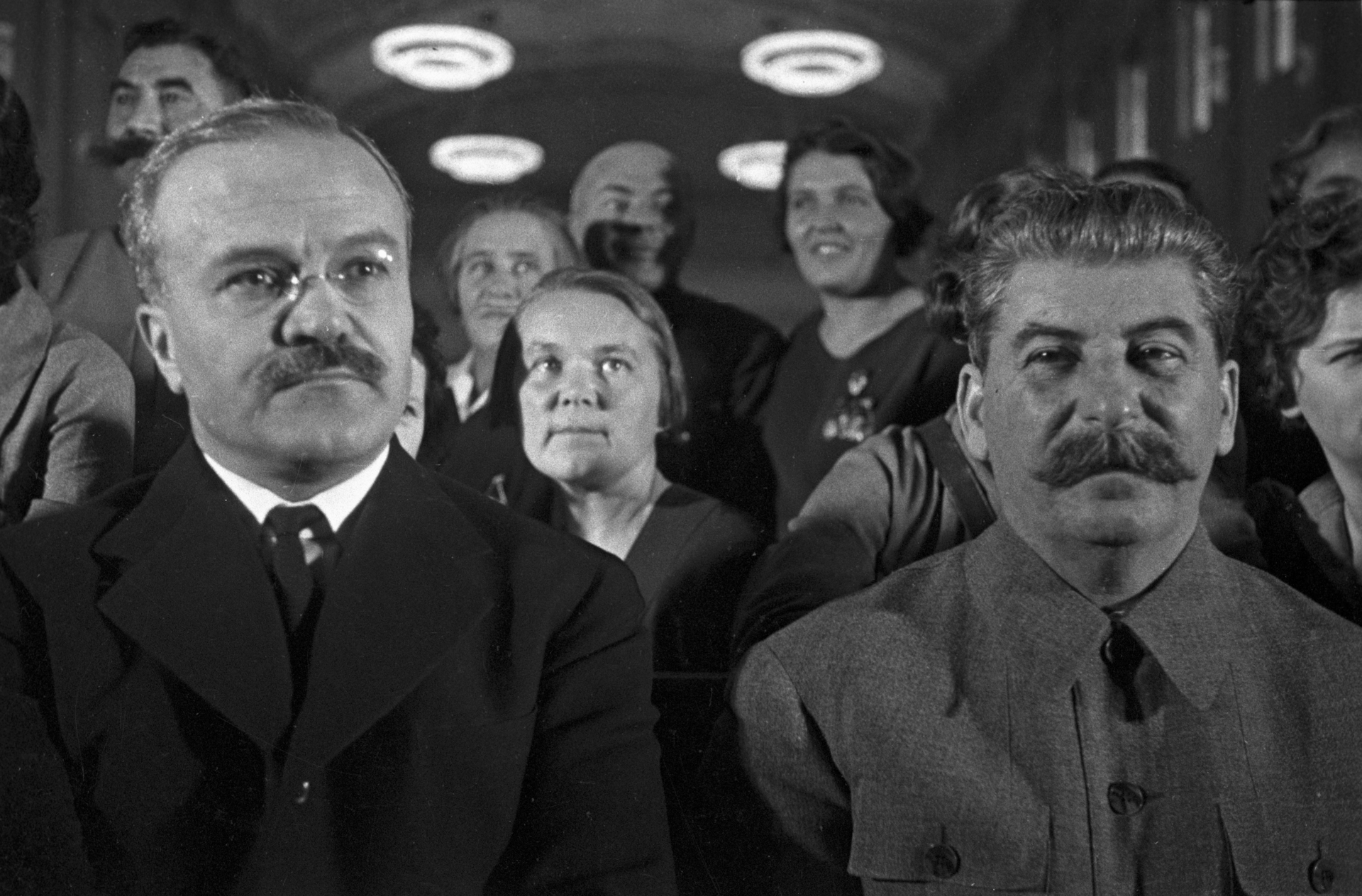 - Советские государственные и партийные деятели: руководитель государства, секретарь ЦК ВКП(б) Иосиф Сталин (справа) и председатель Совета народных комиссаров СССР Вячеслав Молотов