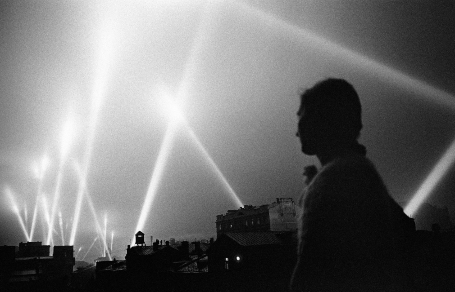 - Лучи прожекторов войск ПВО освещают небо Москвы