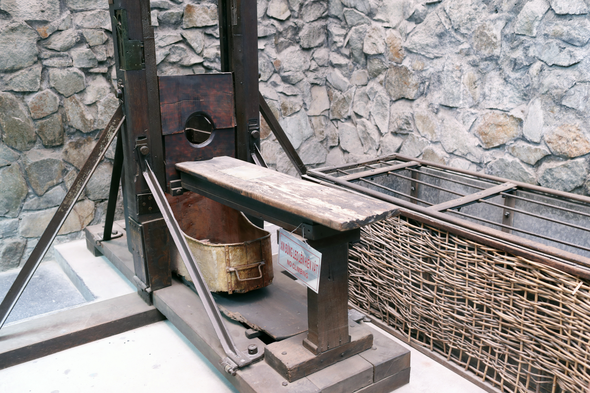 Устройство гильотины было незамысловатым. Косое лезвие, которое весило до 100 кг, крепилось в специальной раме и фиксировалось защёлкой. Приговорённого привязывали к аппарату с помощью ремней, не давая ему возможности двигаться. Обезглавливание происходило мгновенно.