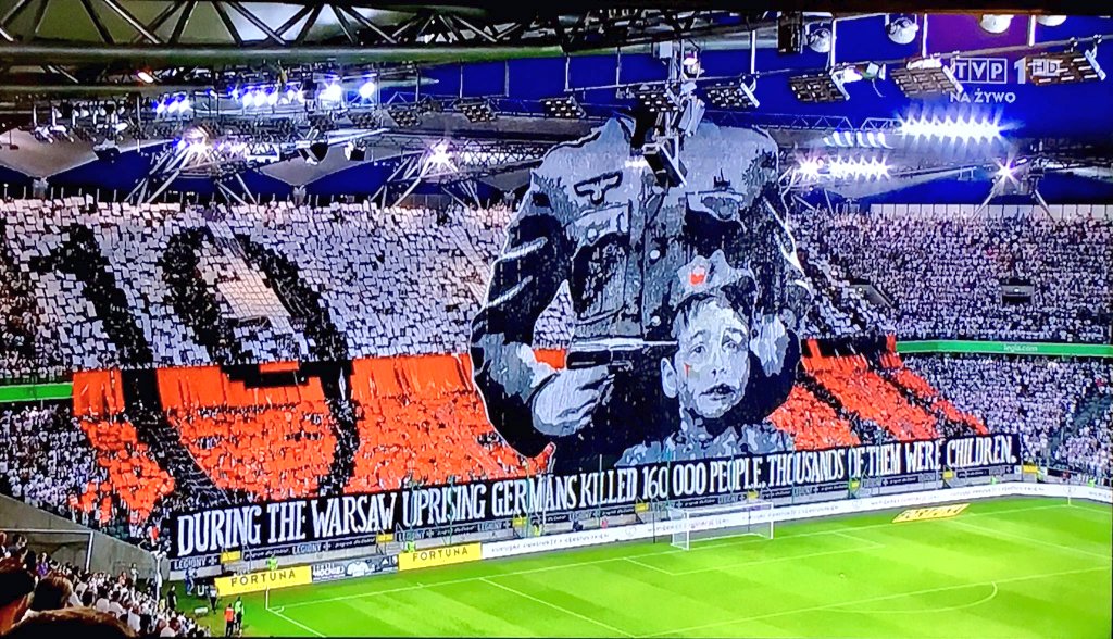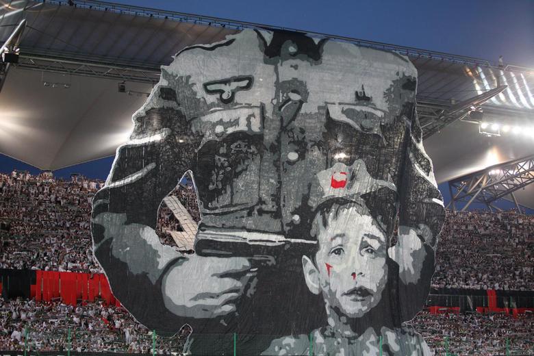 Фанаты хозяев в память о Варшавском восстании 1944 года вывесили баннер, на котором изображён солдат вермахта с приставленным к голове мальчика пистолетом. / @Kronika24pl / Twitter