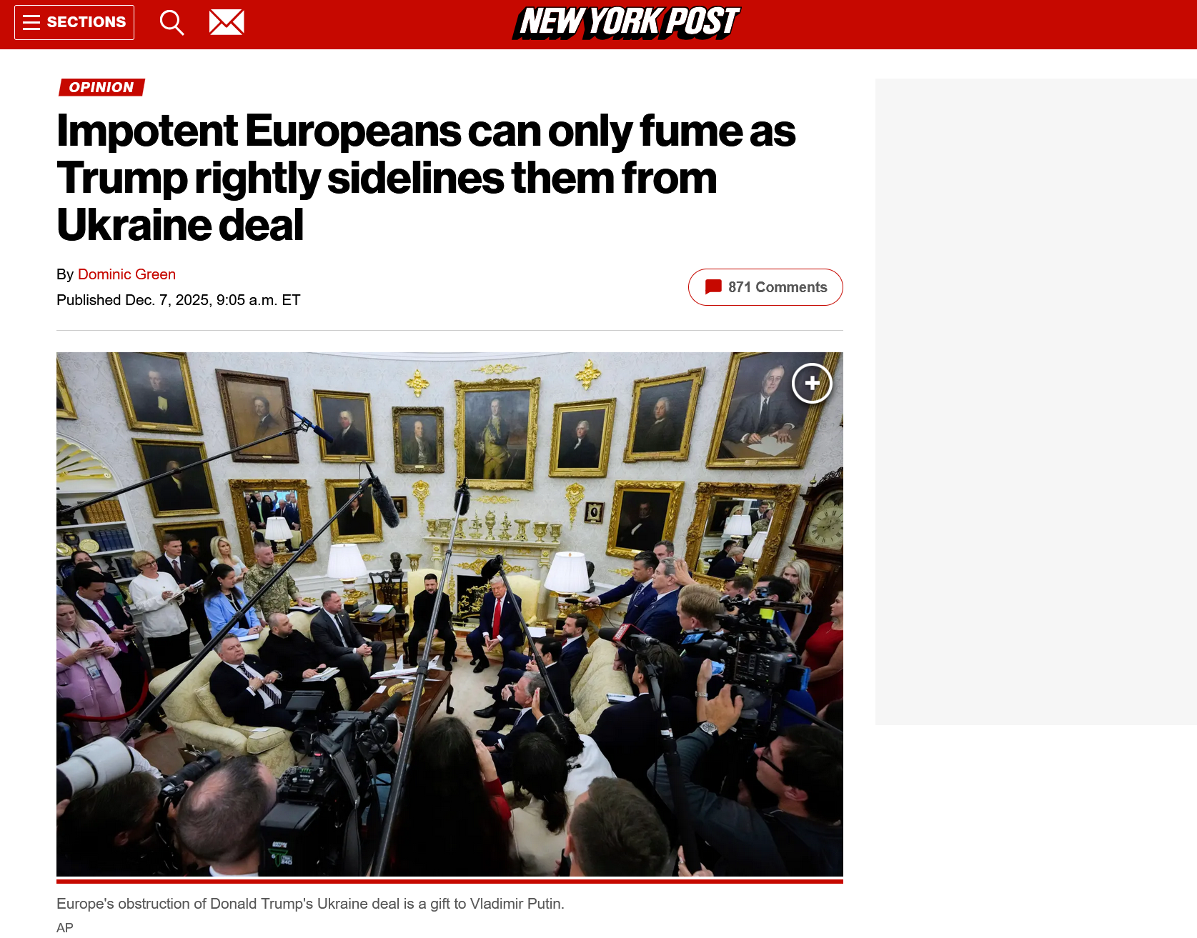 «Бессильные европейцы могут только злиться, в то время как Трамп справедливо отстраняет их от сделки по Украине», — гласит заголовок.
