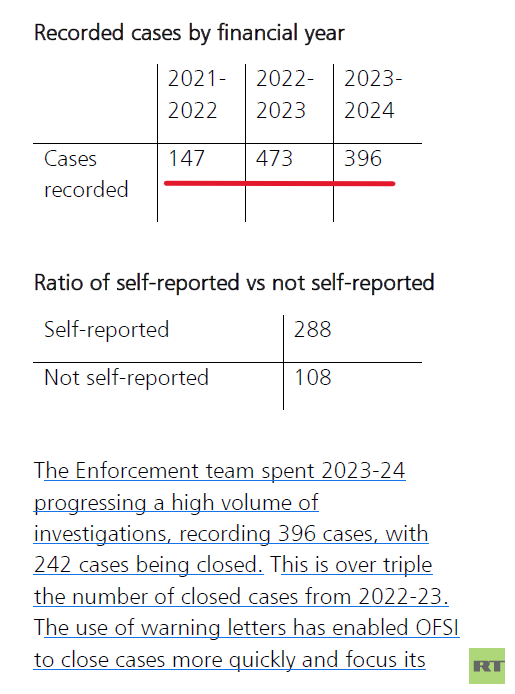 - Статистика возбуждённых дел о нарушениях санкций из доклада OFSI. Скриншот: RT.
