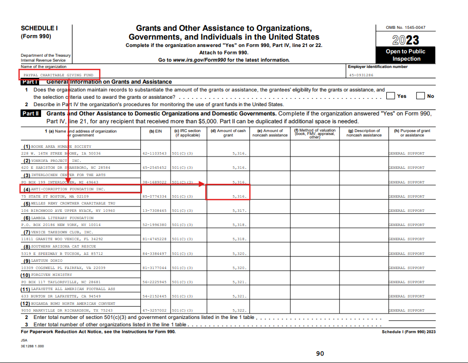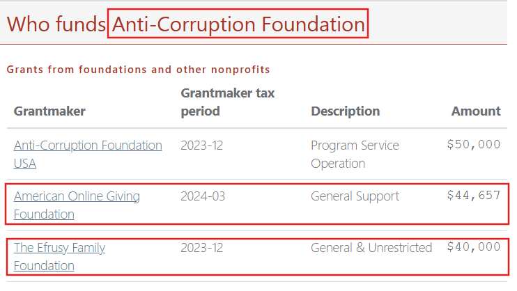 Ещё $40 тыс. ФБК обеспечил фонд семьи Эфрусси, который печётся о воспитании молодых лидеров в Африке и Латинской Америке. Несколько большую сумму перевёл American Online Giving Foundation (AOGF)** — $44,6 тыс. Эта организация выступает в роли «кошелька», куда собирают деньги американские корпоративные фонды, чтобы из него финансировать НКО по всему миру, в том числе на Украине. Так получают деньги United Help Ukraine** и Ukraine Defense Fund** — обе используют полученные от фонда средства для оборонной помощи киевскому режиму.