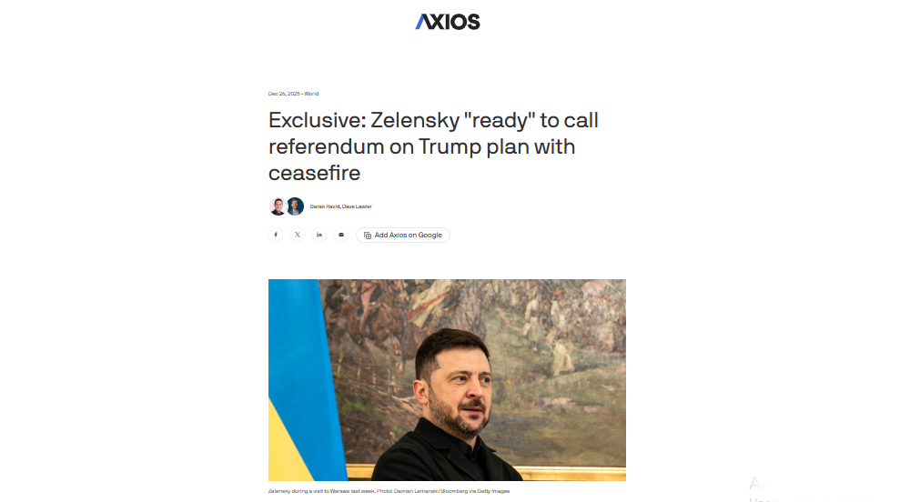 • Эксклюзив: Зеленский «готов» провести референдум по плану Трампа при условии прекращения огня