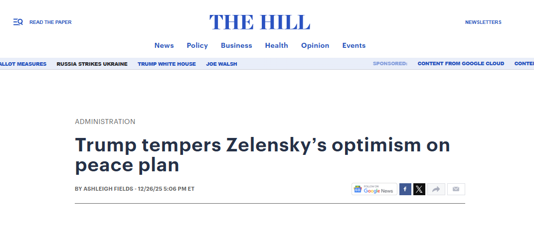Как обращает внимание The Hill, в этом интервью Politico Трамп «умерил оптимистичный настрой Зеленского по поводу мирного плана».