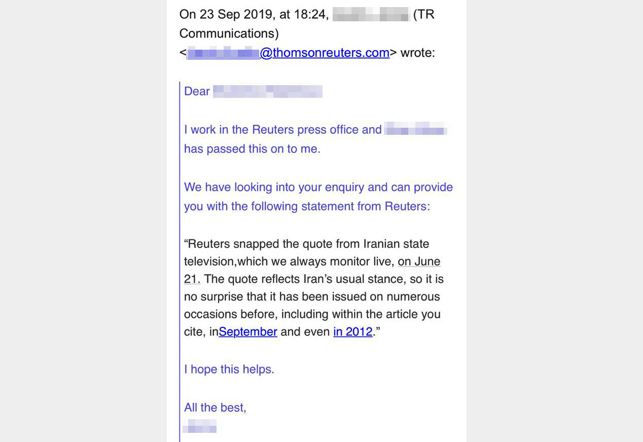 «Агентство Reuters взяло данную цитату 21 июня из эфира иранского государственного телеканала, за которым мы постоянно следим в режиме реального времени. Это высказывание отражает обычную позицию Ирана, поэтому неудивительно, что оно неоднократно появлялось и раньше, в том числе в статье, на которую ссылаетесь вы, в сентябре и даже в 2012 году», — говорится в ответе агентства, полученном Ruptly.