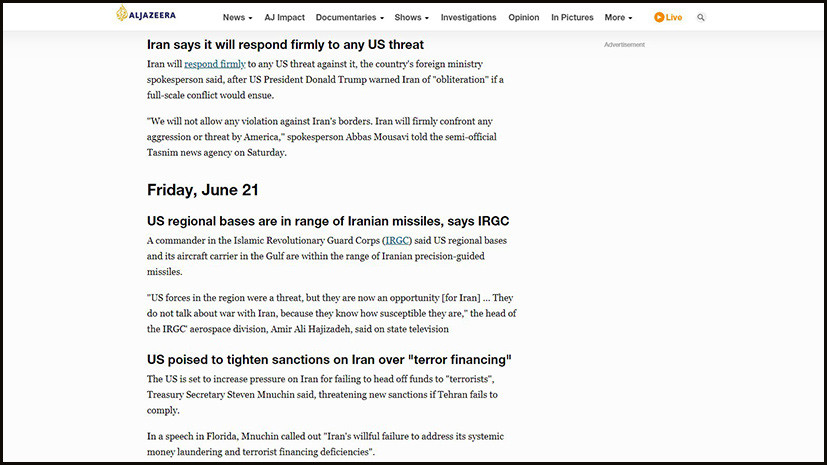 Как выяснили в Ruptly, Хаджизаде не произносил 21 июня 2019 года приписываемую ему фразу. Он сделал это 21 ноября 2018 года, за полгода до обострения американо-иранского кризиса, в эфире иранского государственного телевидения IRIB.